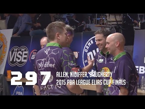 In the trios match of the 2015 PBA League Elias Cup Finals, the Silver Lake Atom Splitters team of Dick Allen, Craig Nidiffer and Tom Daugherty roll 297 to take the overall lead in the match against L.A. X going into the final game. Silver Lake went on to win the Elias Cup.